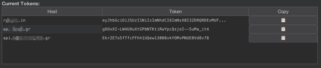 The extension provides real-time visibility into captured tokens through a dedicated table in the UI. It stores tokens separately per host, allowing concurrent testing of multiple applications while managing each host’s token independently.